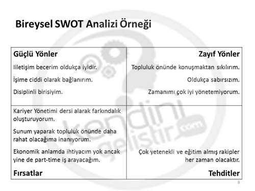 Swot analizi yapabilirsin. Bir kağıdı 4’ e bölüp aşağıdaki örneği inceleyerek kendin için bir analiz yapabilirsin. Kendine sakin bir ortam yarat ve düşün. İyice derinlere in ve kendini sorgula. Bu çalışmayı kağıt üzerinde yaptığında senin için her şey daha net bir şekilde ortaya çıkacaktır.