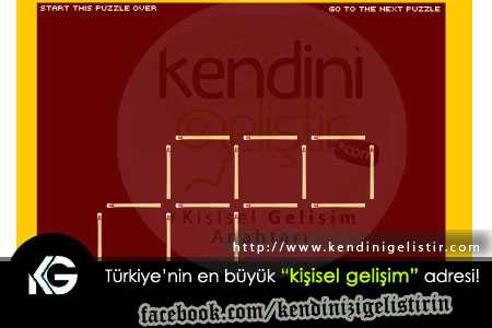 Bağımlılık yapacak, hafif kafayı çizdirecek, düşündürecek bir oyun. Mutlaka görmüşsünüzdür. Hatta aranızda bile oynamışsınızdır bu oyunun bir bölümünü. Oyun şöyle : 6 farklı soru var. Ve sınırlanan hareket sayısı ile kibritlerin yerlerini değiştirip, istenilen şeyleri üretmeye çalışıyoruz. Oyun etap atladıkça biraz daha zorlaşıyor haliyle… Gayet zevkli, beceri gerektiren, zeka kokan bir oyun… İyi eğlenceler ;)