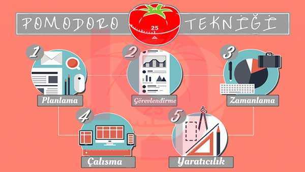 Pomodoro metodu, zamanı etkili bir şekilde kullanmak üzerine kurulu bir metod. Basitçe anlatacak olursak; her ne yapıyorsanız bunu pomodorolara bölmek. Yani yaptığınız işi 25 dakika boyunca odaklanarak yapmak ve ardından 5 dakikalık bir ara vermek. Bu yöntemle hem yaptığınız işten aldığınız verim artacak, hem de bu yöntem zamanınızı planlamanıza katkı sağlayacak.
